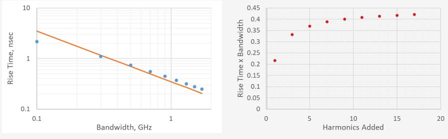 此仿真可用于執(zhí)行簡(jiǎn)單的數(shù)值實(shí)驗(yàn),將每個(gè)仿真波形的 10% 到 90% 上升時(shí)間與其設(shè)計(jì)帶寬進(jìn)行比較。并與常用的近似值 RT = 0.35/BW 相比,10% 到 90% 上升時(shí)間與設(shè)計(jì)帶寬之間的關(guān)系如下圖所示,上升時(shí)間和帶寬成反比。這種關(guān)系的一個(gè)有用的品質(zhì)因數(shù)是上升時(shí)間帶寬積。在這個(gè)數(shù)值實(shí)驗(yàn)中,每一項(xiàng)都是有明確定義的。隨著諧波次數(shù)的增加,該乘積也下圖所示。
