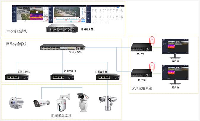 聯(lián)網(wǎng)方案:1、采用星型組網(wǎng)架構(gòu),通過交換機組網(wǎng),將數(shù)據(jù)匯聚回傳至本地監(jiān)控室;2、部署艾睿工業(yè)測溫監(jiān)控系統(tǒng),通過系統(tǒng)進行攝像機配置,包括接收人員入侵報警、設(shè)備高溫預(yù)警、火點檢測報警等