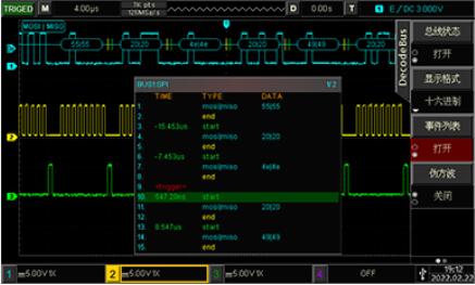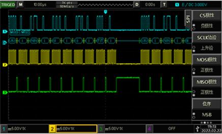 2.打開示波器解碼功能選擇SPI協(xié)議解碼,設(shè)置所對應(yīng)的源與所連接的通道相對應(yīng),根據(jù)實際的編碼的信號特性來設(shè)置示波器對應(yīng)的解碼CS/SCLK/MOSI/MISO信號和位序等相關(guān)設(shè)置,即可得到解碼后的結(jié)果。