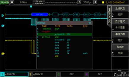 2.打開示波器中協(xié)議解碼功能選擇I2C協(xié)議解碼,將對應(yīng)的時鐘源與數(shù)據(jù)源選擇好對應(yīng)的通道后,設(shè)置地址模式和數(shù)據(jù)所在的地址,將結(jié)果使用ASCII碼格式顯示即可清晰的觀察到解碼的結(jié)果。