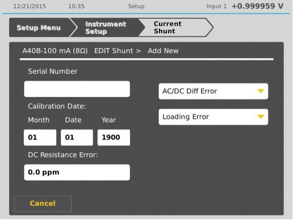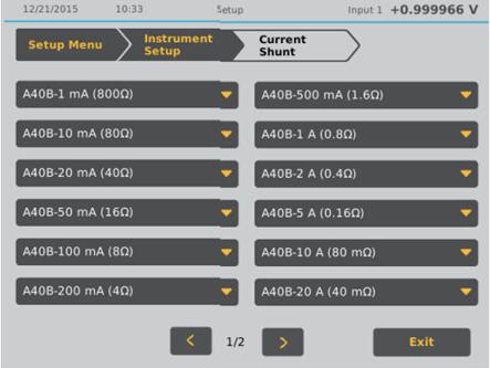 電流分流器菜單位于設(shè)置菜單下,可通過觸摸屏顯示屏上的設(shè)置菜單”Setup”訪問。當(dāng)前分流器的所有添加、編輯和管理僅通過此菜單完成。主菜單上有一個(gè)選擇已保存分流器的直接鏈接,但這只是選擇分流器,這樣的工作流程可防止分流屬性被意外更改。如概述部分所示,當(dāng)菜單加載時(shí),您將看到一個(gè)標(biāo)準(zhǔn)的A40B電流分流器列表,按其電流值排列。在此要加載分流器,選擇A40B的范圍后,將出現(xiàn)一個(gè)子菜單。要添加分流器,只需選擇添加新分流器“Add New”,如圖所示。