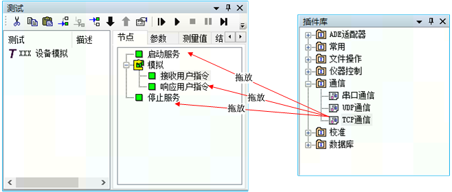 TestCenter軟件內(nèi)置的TCP通信插件、UDP通信插件為TestCenter增加了網(wǎng)絡通信能力。在TestCenter可視化開發(fā)環(huán)境中,用戶無需編寫程序代碼,通過拖放-組裝TCP通信插件或UDP通信插件開發(fā)測試程序即可實現(xiàn)與專用模擬器、被測件等設備的網(wǎng)絡通信。除與儀器設備、被測件進行網(wǎng)絡通信,TestCenter的網(wǎng)絡通信能力還可以與第三方軟件、分布在其它站點的TesCenter程序進行網(wǎng)絡通信,從而為協(xié)同測試提供了支撐。