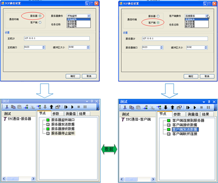 使用TCP協(xié)議在TestCenter軟件之間通信的一個重要的意義是協(xié)調(diào)兩個或多個測試端進行協(xié)同測試。用戶在TestCenter集成開發(fā)環(huán)境中使用TCP通信插件開發(fā)TCP服務器端或客戶端測試程序,并將其部署在不同的計算機或同一臺計算機即可實現(xiàn)TestCenter應用程序間的TCP通信。在不同的計算機或同一臺計算機分別啟動服務器端測試程序和客戶端測試程序,通過配置通信端口,服務器端和客戶端測試程序執(zhí)行過程中進行數(shù)據(jù)交互,實現(xiàn)測試程序間的協(xié)同測試。
