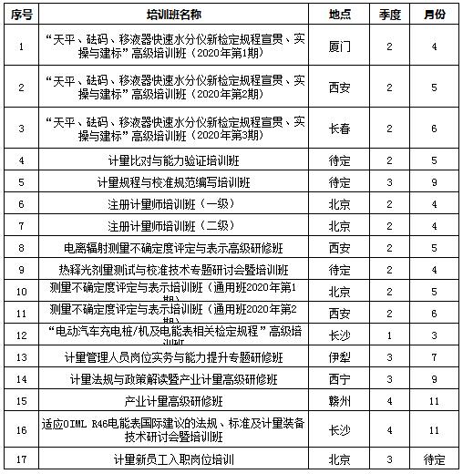 現(xiàn)將2020年度第一批培訓計劃公布如下,敬請各計量技術機構及相關企事業(yè)單位根據(jù)需求選派相關技術人員報名參加。