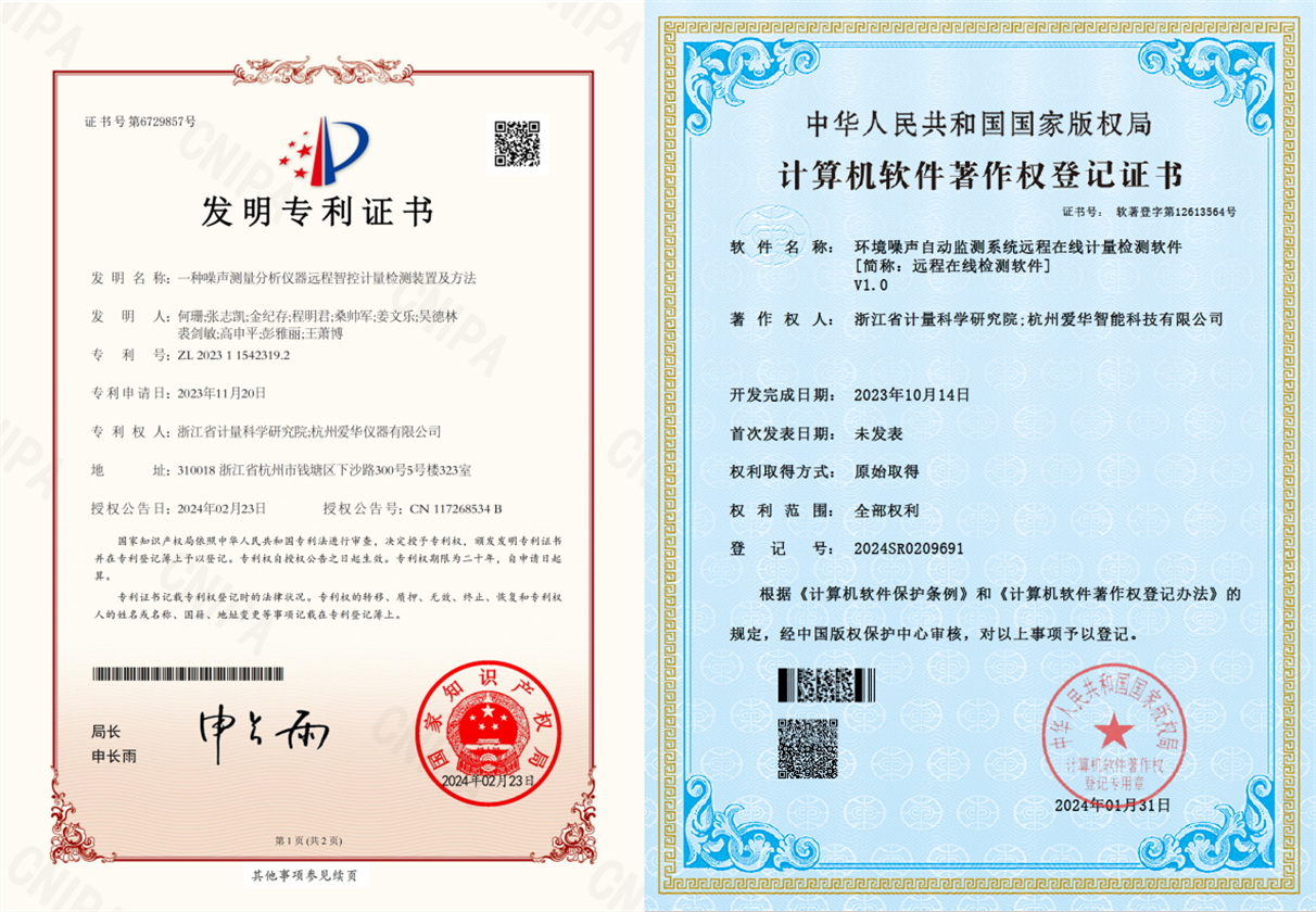 近日,浙江省計量院在噪聲領域新獲兩項成果,其中為主撰寫的“一種噪聲測量分析儀器遠程智控計量檢測裝置及方法”獲發(fā)明專利授權(quán);為主設計研發(fā)的“環(huán)境噪聲自動監(jiān)測系統(tǒng)遠程在線計量檢測軟件[簡稱:遠程在線檢測軟件]”獲國家版權(quán)局著作權(quán)登記證書。