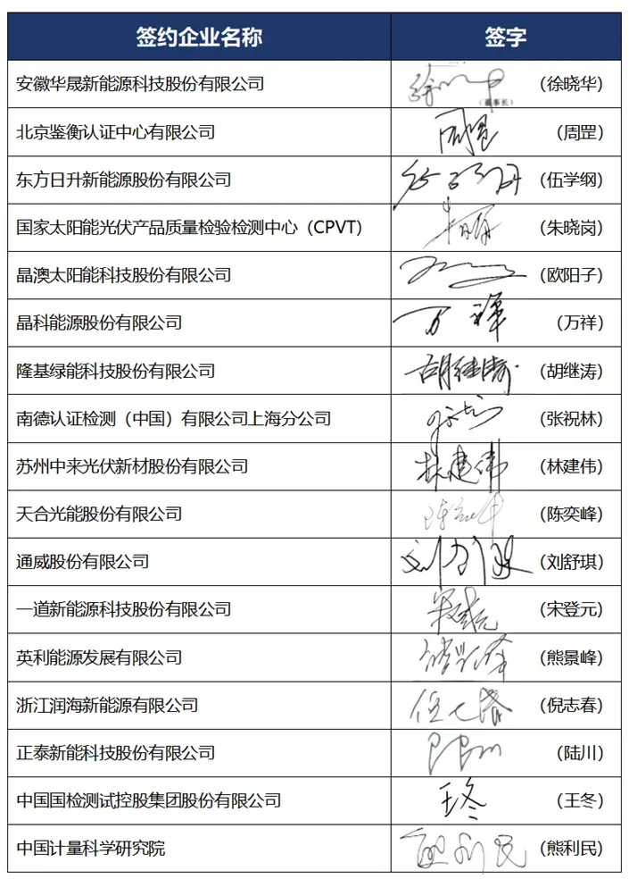 目前簽約企業(yè)名單包括華晟新能源、鑒衡認(rèn)證、東方日升、CPVT、晶澳科技、晶科能源、隆基綠能、TüV南德(上海分公司)、中來(lái)光伏、天合光能、通威股份、一道新能源、英利能源、潤(rùn)海新能源、正泰新能、CTC國(guó)檢集團(tuán)、中國(guó)計(jì)量院等17家企業(yè)。