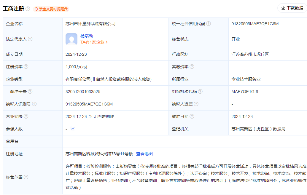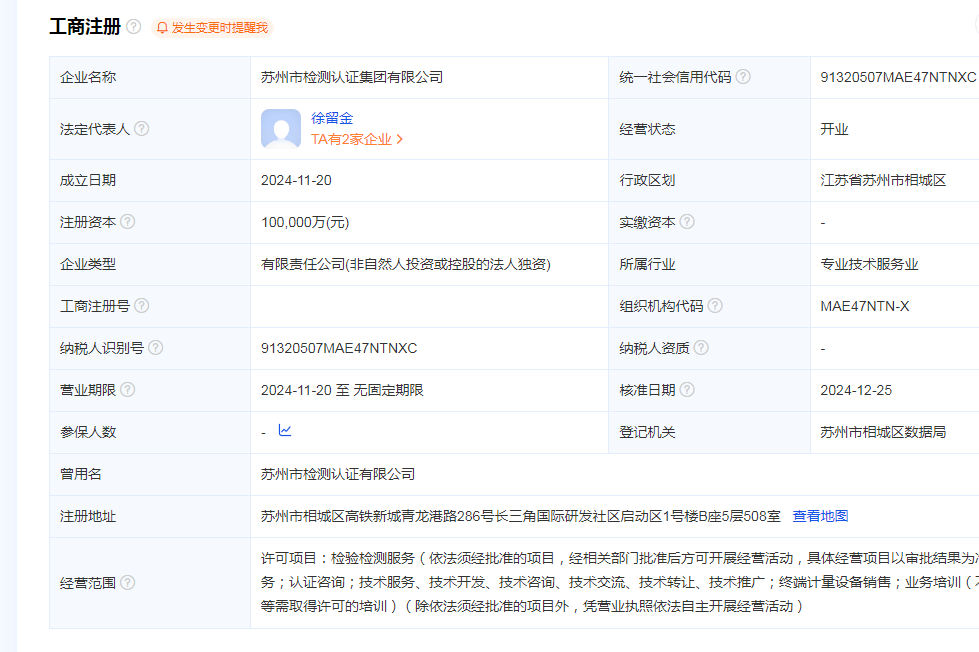 計量資訊速遞近日獲悉,蘇州的計量檢驗檢測機構(gòu)已在進行中,2024年11月,蘇州市檢測認證集團有限公司注冊成立,注冊資本為10億元,法定代表人為徐留金。