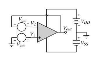 如果在設(shè)計電路時存在差分放大電路,原信號具有相同的直流電壓,通過差分放大電路將共模成分給濾掉,放大差模信號,輸出可能也會存在一定的共模電壓。這主要是運放不能完全將共模成分濾掉,它存在一個共模抑制比(CMRR)的參數(shù)用于判斷該運放對于共模電壓抑制的能力,一般CMRR越大,抑制效果越好,如圖1-2所示共模電路。