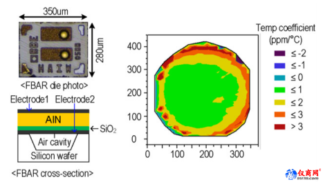 圖為薄膜體聲波諧振器芯片照片以及溫度系數(shù)測試結(jié)果,芯片面積小于0.01mm2,在六寸晶圓上其溫度系數(shù)中位數(shù)僅為0.89ppm/°C