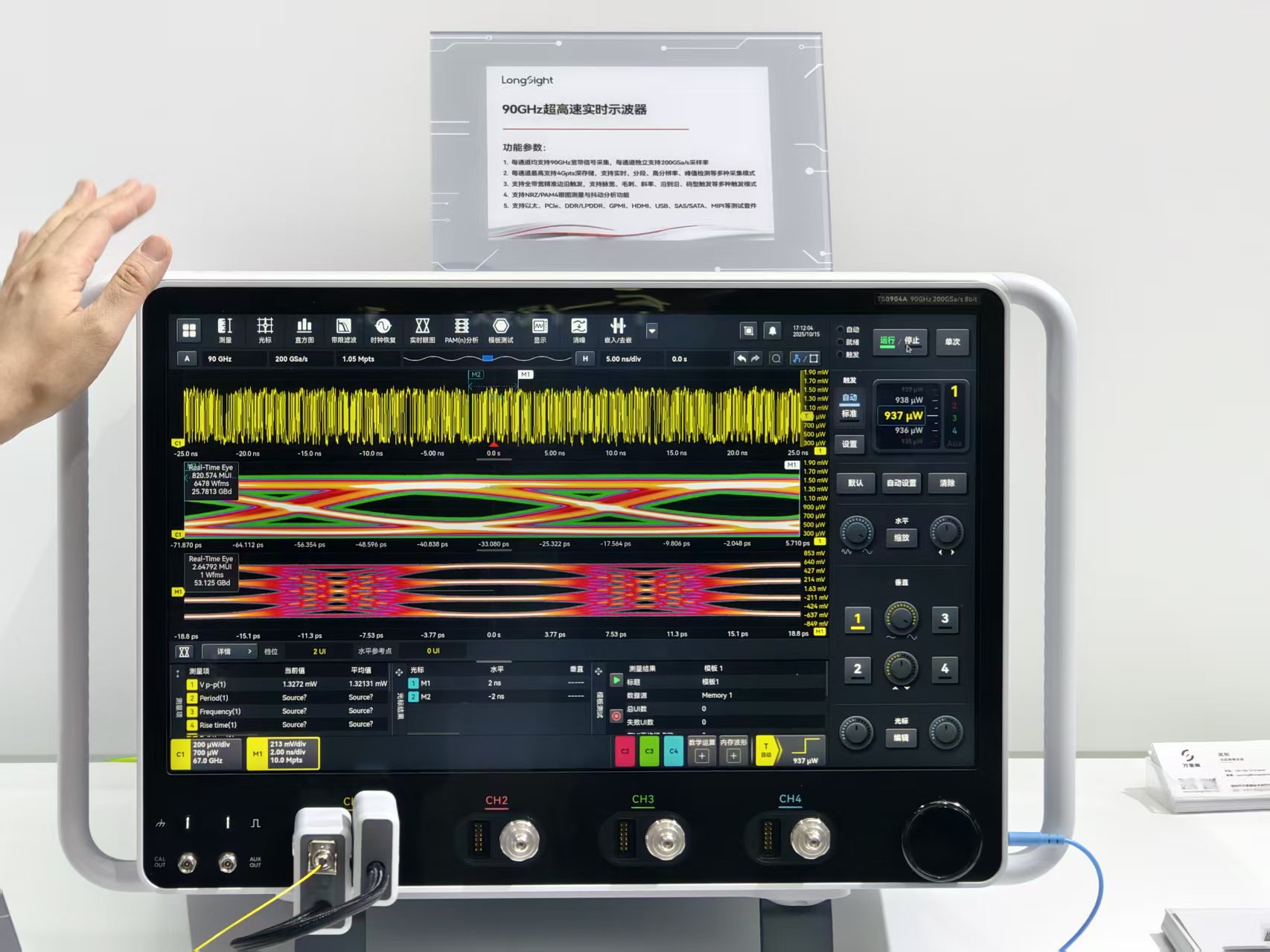 10月15日下午,新凱來子公司萬里眼在2025灣芯展上展示了新一代超高速實時示波器,其帶寬突破90GHz,在半導體、6G通信、光通信、智能駕駛等領域具備廣闊的產(chǎn)業(yè)化應用前景。展臺工作人員表示:“這個示波器目前達到了全國第一,全球第二的水平。”