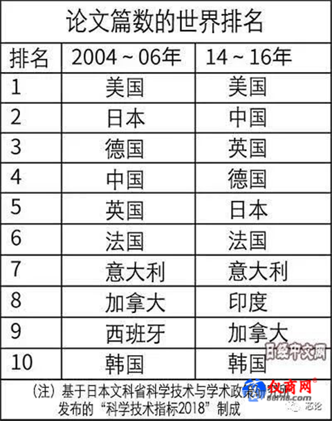 日本文部科學(xué)省發(fā)布的“科學(xué)技術(shù)指標(biāo)2018”顯示,從2014年至2016年各國發(fā)表的論文篇數(shù)占整體的比例來看,美國為25.1%,中國為19.9%。均大幅超過居第3位的英國(7.1%)和第5位的日本(5.5%)。