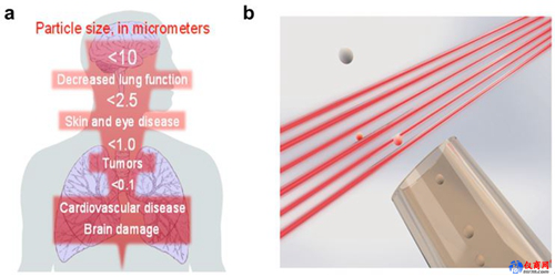圖1 a、細(xì)顆粒物對(duì)人體健康的危害隨粒徑尺寸的關(guān)系;b、納米光纖傳感器示意圖。