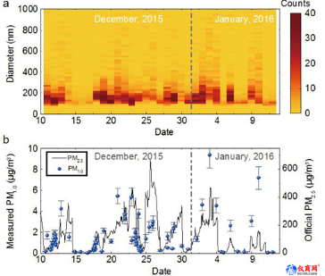圖2 基于納米光纖的大氣質(zhì)量監(jiān)測(cè)。a、空氣顆粒物粒徑分布及其實(shí)時(shí)演化;b、空氣顆粒物質(zhì)量濃度(PM1.0)及官方數(shù)據(jù)(PM2.5)。空氣樣品實(shí)時(shí)采集于北京大學(xué)物理學(xué)院院內(nèi)。