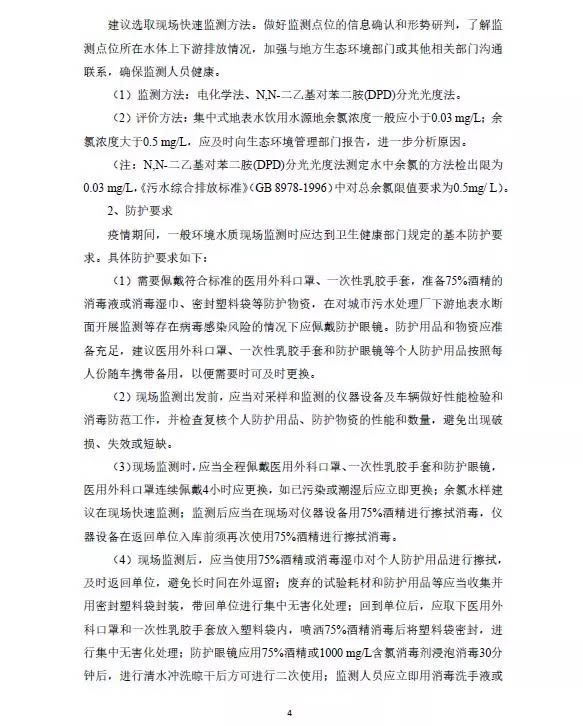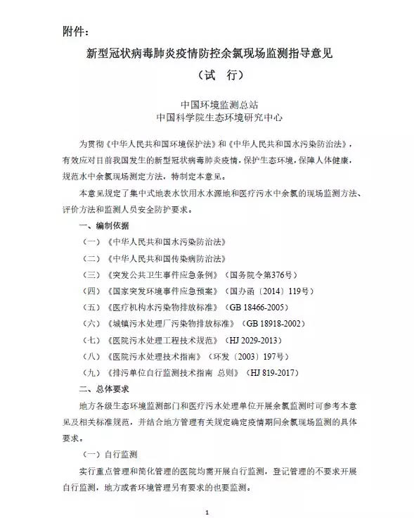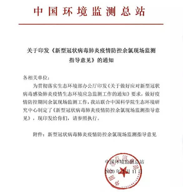 近日,為做好疫情防控期間余氯現(xiàn)場(chǎng)監(jiān)測(cè)工作,制定集中式地表水飲用水水源地和醫(yī)療污水中余氯的現(xiàn)場(chǎng)監(jiān)測(cè)方法,中國(guó)環(huán)境監(jiān)測(cè)總站發(fā)布《新型冠狀病毒肺炎疫情防控余氯現(xiàn)場(chǎng)監(jiān)測(cè)指導(dǎo)意見(jiàn)》,詳情如下: