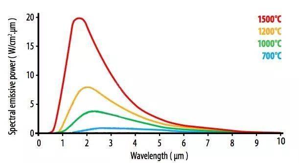 反映到圖里就是,1500℃的紅色高溫曲線,在每段波長上強度都比1200℃的黃色曲線高: