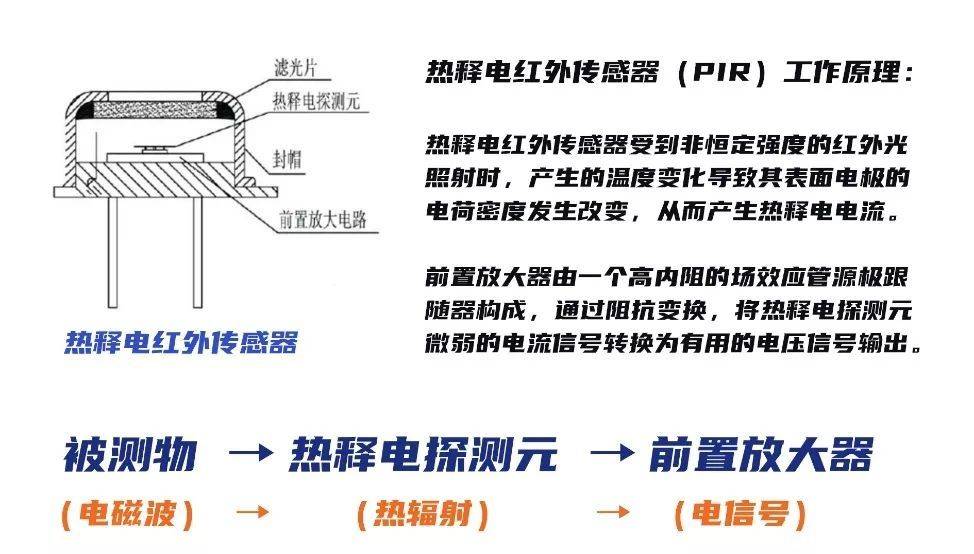 這個能將接收到的“紅外電磁波輻射”轉(zhuǎn)換為“熱輻射”(黑體輻射過程),進而把“熱輻射”轉(zhuǎn)化為電信號(熱電轉(zhuǎn)化過程)的東西就是:熱釋電紅外傳感器(簡稱:PIR)。