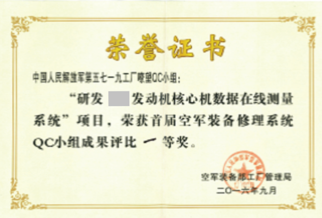 國(guó)營(yíng)川西機(jī)器廠(中國(guó)人民解放軍第五七一九工廠)是空軍裝備部直屬的航空發(fā)動(dòng)機(jī)修理工廠、新型航空發(fā)動(dòng)機(jī)修理基地。工廠以技術(shù)創(chuàng)新、管理創(chuàng)新和手段創(chuàng)新為路徑,自主研發(fā)560余項(xiàng)航空發(fā)動(dòng)機(jī)維修技術(shù)標(biāo)準(zhǔn);創(chuàng)建了再制造技術(shù)體系,國(guó)內(nèi)率先實(shí)現(xiàn)金屬3D打印技術(shù)在航空發(fā)動(dòng)機(jī)上的批量應(yīng)用;具備上萬(wàn)項(xiàng)軍民品航空零部件制造能力;是美國(guó)GE航空集團(tuán)、漢勝公司航空零部件的直接供應(yīng)商。擁有國(guó)家專(zhuān)利授權(quán)130項(xiàng)(其中發(fā)明專(zhuān)利36項(xiàng)),獲得國(guó)家、省部級(jí)、市級(jí)等科技進(jìn)步獎(jiǎng)30余項(xiàng),是17項(xiàng)國(guó)家標(biāo)準(zhǔn)的主要起草單位。某型發(fā)動(dòng)機(jī)核心機(jī)數(shù)據(jù)在線測(cè)量系統(tǒng),是工廠自主研制的用于發(fā)動(dòng)機(jī)核心機(jī)修理過(guò)程的數(shù)據(jù)測(cè)量系統(tǒng),旨在提升核心機(jī)裝配質(zhì)量,壓縮裝配周期,項(xiàng)目實(shí)施后取得了良好的效果。該項(xiàng)目在2016年獲得了“空軍裝備修理系統(tǒng)首屆質(zhì)量改進(jìn)成果評(píng)比獎(jiǎng)”一等獎(jiǎng)(見(jiàn)圖1)。
