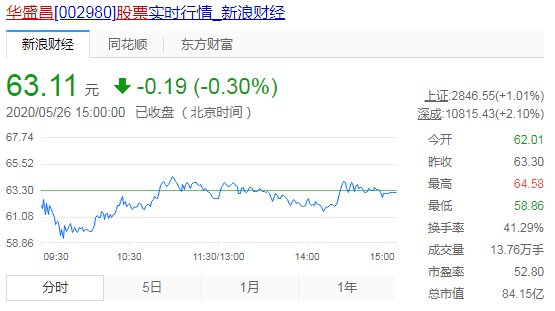 處于輿論漩渦中的次新股華盛昌,5月25日早上開盤后,最初跌近9%,隨后跌幅收窄。下午開盤后仍呈下跌趨勢,曾一度跌停,最終收報63.30元,跌幅8.26%;換手率為48.78%,成交量1626.01萬股。而記者昨日幾次撥打公司電話,欲就投資者關(guān)心的一些問題采訪公司負責人,均未聯(lián)系上。