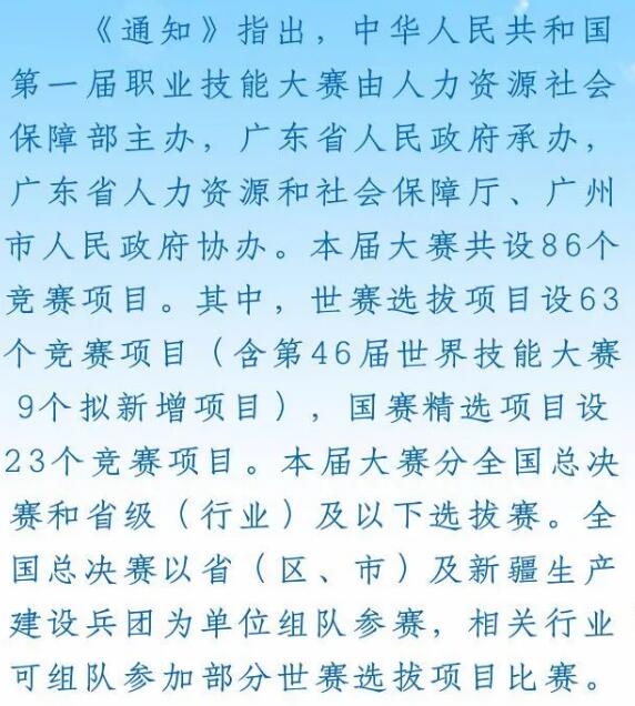 為深入貫徹落實(shí)習(xí)近平總書記對(duì)技能人才工作的重要指示精神,充分發(fā)揮職業(yè)技能競(jìng)賽在促進(jìn)技能人才培養(yǎng)、推動(dòng)職業(yè)技能培訓(xùn)和弘揚(yáng)工匠精神的重要作用,營(yíng)造勞動(dòng)光榮、技能寶貴、創(chuàng)造偉大的社會(huì)風(fēng)氣,更好服務(wù)就業(yè)創(chuàng)業(yè)和經(jīng)濟(jì)高質(zhì)量發(fā)展。經(jīng)國(guó)務(wù)院批準(zhǔn),從2020年起,我國(guó)每?jī)赡陮⑴e辦一屆中華人民共和國(guó)職業(yè)技能大賽。近日,人力資源社會(huì)保障部印發(fā)《關(guān)于舉辦中華人民共和國(guó)第一屆職業(yè)技能大賽的通知》。