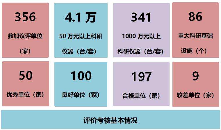這份由科技部辦公廳和財政部辦公廳發(fā)布的文件指出,共有25個部門356家單位參加評價考核,涉及原值50萬元以上科研儀器共計4.1萬臺(套),其中原值1000萬元以上的341臺(套),涵蓋同步輻射光源、加速器、科考船、風洞等重大科研基礎設施86個。