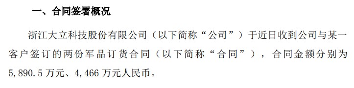 12月30日,大立科技發(fā)布公告稱,公司于近日收到公司與某客戶簽訂的兩份軍品訂貨合同(以下簡(jiǎn)稱“合同”),合同金額分別為5,890.5萬(wàn)元、4,466萬(wàn)元人民幣。