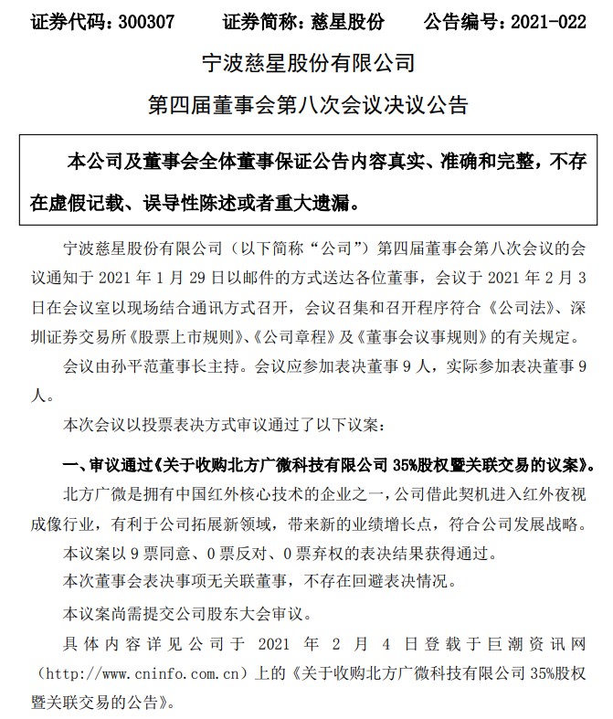 北方廣微是擁有中國紅外核心技術(shù)的企業(yè)之一,在軍隊系統(tǒng)實現(xiàn)了國內(nèi)非制冷紅外探測器產(chǎn)品的進(jìn)口替代,并在軍隊系統(tǒng)大規(guī)模列裝,得到普遍贊譽。作為中國代表性的紅外技術(shù)公司,技術(shù)底蘊深厚,業(yè)內(nèi)知名度高。 慈星股份借此契機(jī)進(jìn)入紅外夜視成像行業(yè),有利于公司拓展新領(lǐng)域,帶來新的業(yè)績增長點,符合公司發(fā)展戰(zhàn)略。