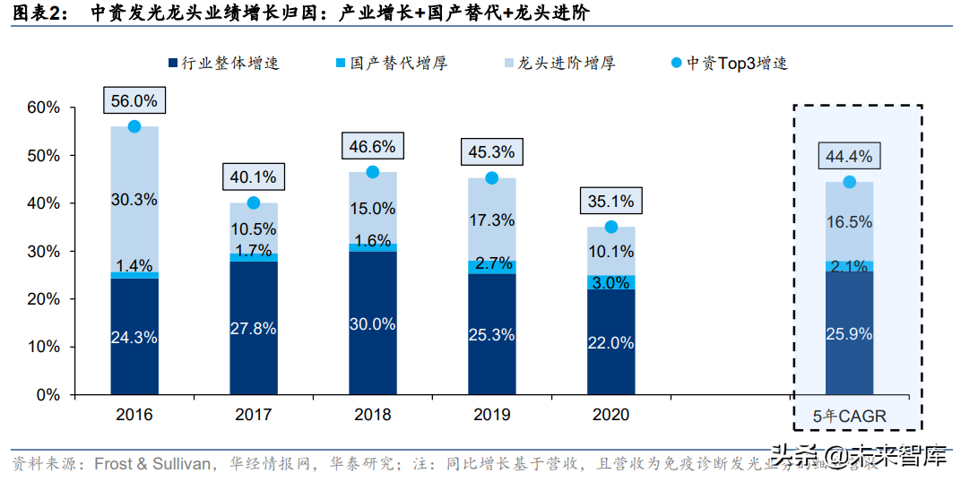 IVD 免疫診斷發(fā)光賽道是區(qū)分看待業(yè)績空間 vs 產(chǎn)業(yè)空間的最佳例證之一。免疫診斷是 IVD 中市場規(guī)模最大的細(xì)分領(lǐng)域,化學(xué)發(fā)光是免疫診斷的主流技術(shù),根據(jù)沙利文研究,2015 年 至 2020 年,中國免疫診斷市場規(guī)模從 107 億元上升至 338 億元,5 年 CAGR 為 25.9%, 遠(yuǎn)高于醫(yī)藥行業(yè)整體增速,但跨產(chǎn)業(yè)對比來看,25.9%的年化增速并沒有絕對優(yōu)勢,不過事 實上,A 股龍頭上市公司(Top3)在該領(lǐng)域同期營收 CAGR 達(dá) 44.4%,如果純粹基于產(chǎn)業(yè) 空間思維去進(jìn)行跨產(chǎn)業(yè)對比,可能無法在 5 年前從成長性角度篩選出這一細(xì)分領(lǐng)域。從 25.9% 的產(chǎn)業(yè)增速到 44.4%的龍頭營收增速,國產(chǎn)替代貢獻(xiàn)了 2.1%,龍頭進(jìn)階貢獻(xiàn)了剩余的 16.5%。