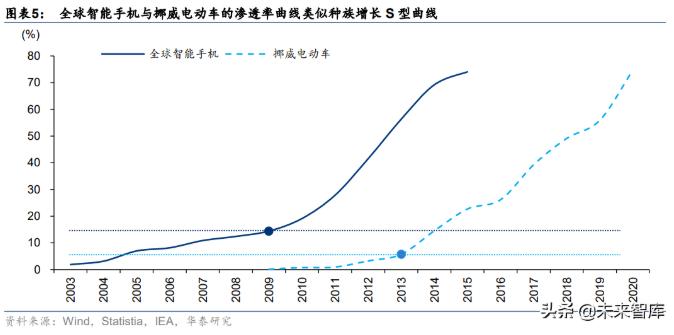 滲透率 S 型曲線的加速點大概率出現(xiàn)在 10%左右。既然滲透率的提升服從種族增長 S 型曲 線,那么 S 型曲線的加速點出現(xiàn)在哪里?從全球智能手機(jī)與挪威電動車的案例來看,這個 點大概率在 10%左右。