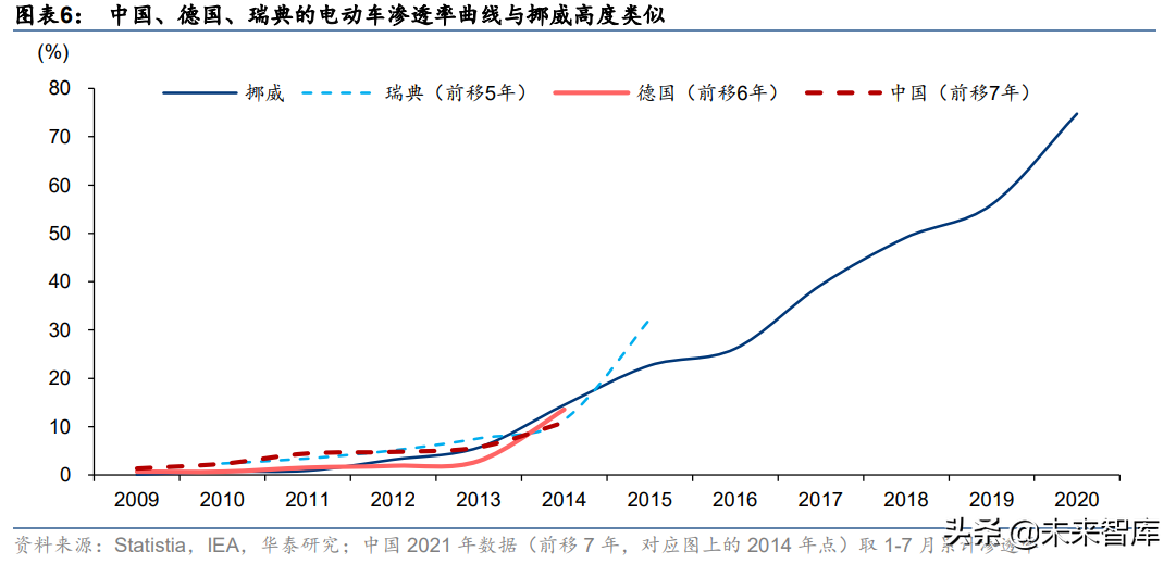 挪威是全球范圍內(nèi)電動車普及最早且滲透率最高的國家,其電動車滲透率曲線值得關(guān)注。 2013 年挪威電動車滲透率為 5.7%,此后開始加速,2008-2013 的 5 年間挪威電動車滲透 率從 1%以下提升到 5.7%,而 2013-2018 的 5 年間滲透率從 5.7%快速提升到 49.1%。此后的兩年中繼續(xù)加速,2020 年滲透率超過 70%。事實上,多國電動車滲透率曲線的前中段 與挪威類似,即滲透率進(jìn)入 5-10%區(qū)間后,開始加速,如中國、德國、瑞典。