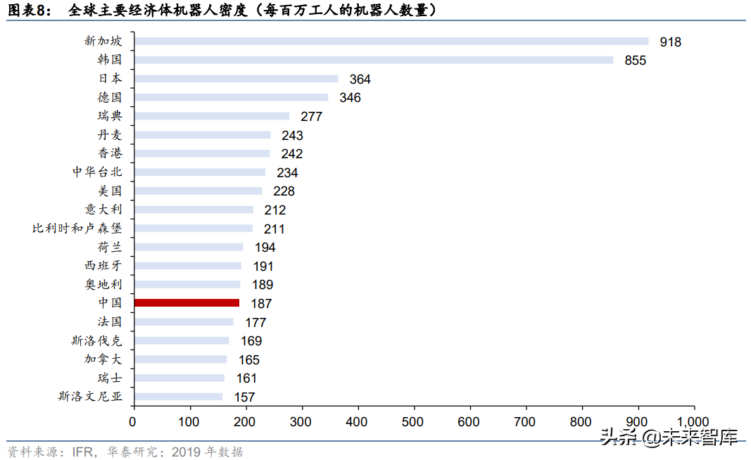 2) 有直接對應(yīng)的一類終端產(chǎn)品的,但該產(chǎn)品的飽和點并不清晰,可考慮橫向?qū)φ辗ㄩg接 計算“滲透率”。這類產(chǎn)業(yè)鏈對應(yīng)的終端產(chǎn)品通常為 2B 產(chǎn)品或服務(wù)業(yè),如航空裝備、 機(jī)器人、醫(yī)美,由于上述產(chǎn)業(yè)的滲透飽和點難以界定,因此,可參考行業(yè)上常用的指 標(biāo)——中國人均軍費開支、機(jī)器人密度(每百萬工人的機(jī)器人數(shù)量)、人均醫(yī)美開支或 就診次數(shù),將其與全球范圍內(nèi)的最高值進(jìn)行對比,間接計算滲透率。以機(jī)器人為例, 根據(jù) IFR,2019 年中國機(jī)器人密度為 187 個機(jī)器人/百萬名工人,相當(dāng)于全球最高水平 新加坡(918 個機(jī)器人/百萬名工人)的 20.4%。