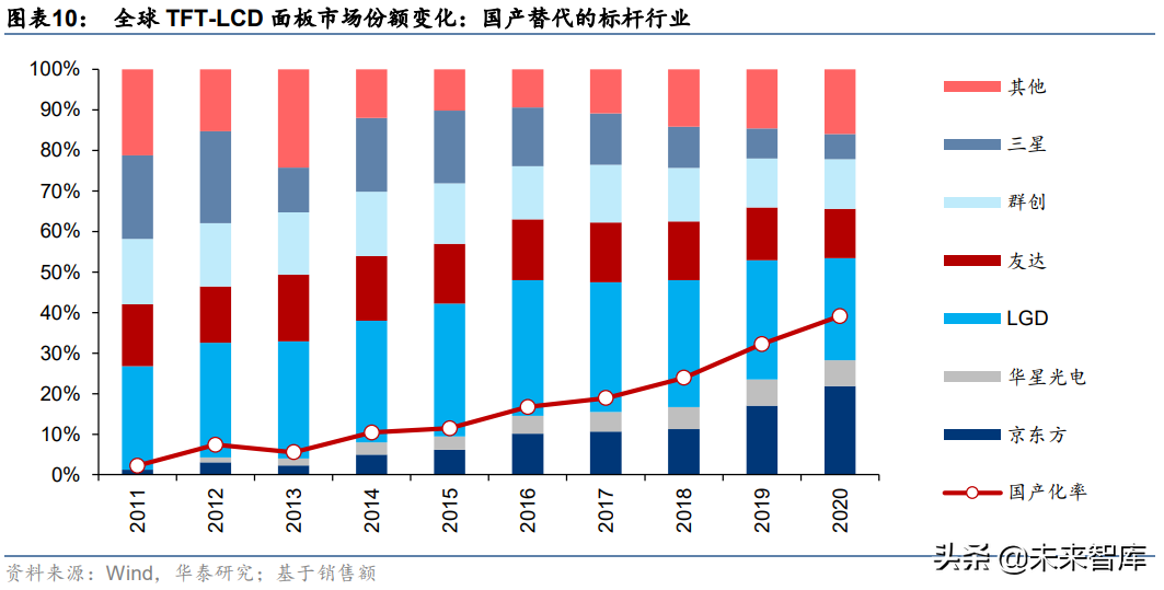 6) 整合:2020 年,全球新冠疫情爆發(fā)之下,居家隔離帶動消費電子需求高漲,而韓國三 星和 LG 面板產(chǎn)能按原計劃陸續(xù)退出,京東方等國產(chǎn)面板品牌借此機(jī)會擴(kuò)張市場份額。