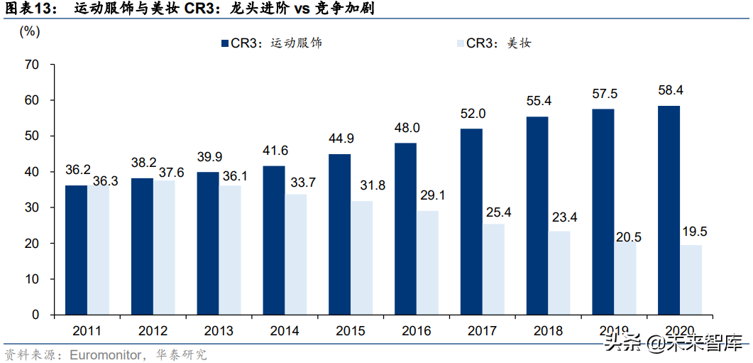 以市占率變化推動的“龍頭進(jìn)階”,是“業(yè)績空間”的第三支柱,其趨勢的研判難度比國產(chǎn) 替代又更高一些。相較于滲透加深的邏輯,國產(chǎn)替代的方向研判有跡可循,節(jié)奏研判的難 度加大,而對于龍頭進(jìn)階,不僅節(jié)奏難以判斷,方向也存在不確定性,站在任意時點或行 業(yè)集中度點上,行業(yè)集中度可能提升,也可能下降。以過去 10 年中市場規(guī)模年化增速較高 的運動服飾、美妝兩大新興消費品為例,2011 年兩者 CR3 均為 36%,而在此期間運動服 飾實現(xiàn)龍頭進(jìn)階(耐克+Adidas+安踏),CR3 上升至 2020 年的 58%,美妝經(jīng)歷競爭加劇, CR3 下降至 2020 年的 20%。