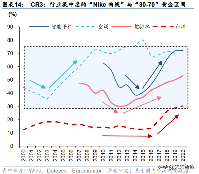 2) 龍頭進(jìn)階傾向于發(fā)生在 30-70%的 CR3 區(qū)間。智能手機(jī)、空調(diào)、挖掘機(jī)的集中度趨勢 回升均發(fā)生在 30-70%的 CR3 區(qū)間,空調(diào)、智能手機(jī)的 CR3 達(dá)到 70%后就進(jìn)入平臺 期,而白酒的 CR3 在 10-20%的區(qū)間長期震蕩。邏輯上,過高或過低的 CR3 都不利于 集中度的趨勢性抬升,CR3 低于 10%時,市場格局尚不清晰,龍頭的競爭優(yōu)勢還不足 以快速整合市場;CR3 超過 70%時,市場已處于壟斷、寡頭或壟斷競爭階段,進(jìn)一步 市場整合的邊際成本加大。