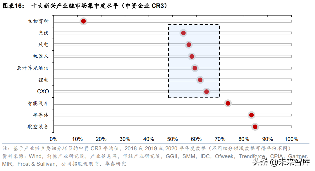 2) 智能汽車、半導(dǎo)體、航空裝備的集中度較高,中資 CR3 超過 70%,航空裝備的高集中 度源自國防安全需求(中航、電工兩大集團(tuán)分擔(dān)了中國軍機(jī)的主要供應(yīng)任務(wù)),或具有 持續(xù)性,而智能汽車、半導(dǎo)體則可能是處于集中度 Nike 曲線的拐點前,具備相應(yīng)技術(shù) 的玩家數(shù)量較少,隨著后續(xù)技術(shù)進(jìn)步,國產(chǎn)內(nèi)部競爭可能加劇,推動中資 CR3 下行。