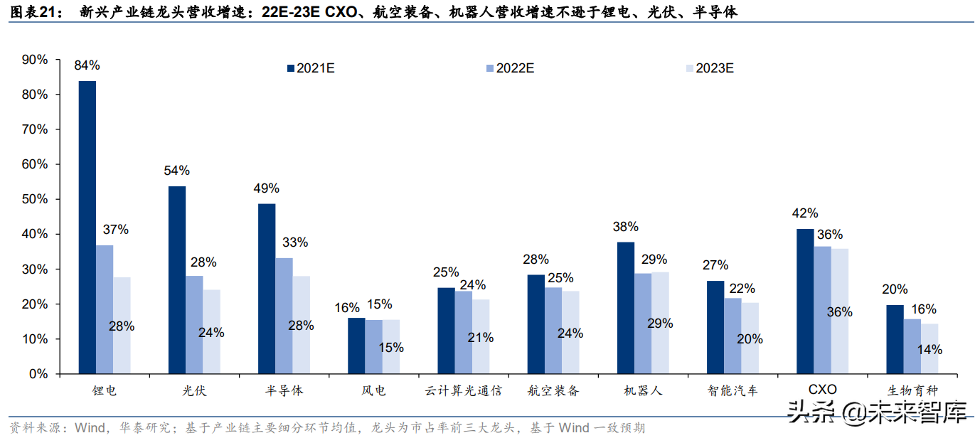 靜態(tài)視角下,2021E-2023E 中資龍頭營收 CAGR 超過 40%的中期成長性較高品種包括:1) 鋰電:三元前驅(qū)體、電解液溶質(zhì)、電解液添加劑、磷酸鐵鋰、三元材料、鈷酸鋰、負(fù) 極材料、電解液、銅箔、碳納米管導(dǎo)電劑;2) 光伏:光伏正銀、PET 基膜、背板、跟蹤支架;3) 半導(dǎo)體:涂膠顯影設(shè)備、測試設(shè)備、射頻芯片、模擬芯片、WiFiMCU 芯片;4) 航空裝備:航空剎車副;5) 機(jī)器人:諧波減速器;6) CXO:臨床前 CRO、大分子 CDMO。