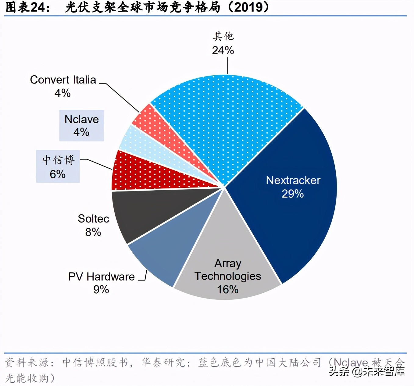 光伏支架。光伏支架位于中游,與組件、線纜、逆變器、匯流箱等環(huán)節(jié)并列,2019 年全球 主要光伏支架供應(yīng)商中,外資廠商 Nextracker、Array Technologies、PV Hardware 列前三 位,中資企業(yè)僅中信博(市占率 6%)、Nclave(被天合光能收購,市占率 4%)進(jìn)入全球 龍頭企業(yè)行列。遠(yuǎn)期空間:若國產(chǎn)化率從 11%提升至 16%(+5pct),中資光伏支架企業(yè) 5 年(2021-2025E)年化營收增速有望達(dá)到 34%;中期空間:根據(jù) Wind 一致預(yù)期,光伏支 架龍頭三年(2021-2023E)年化營收增速有望達(dá) 42%。