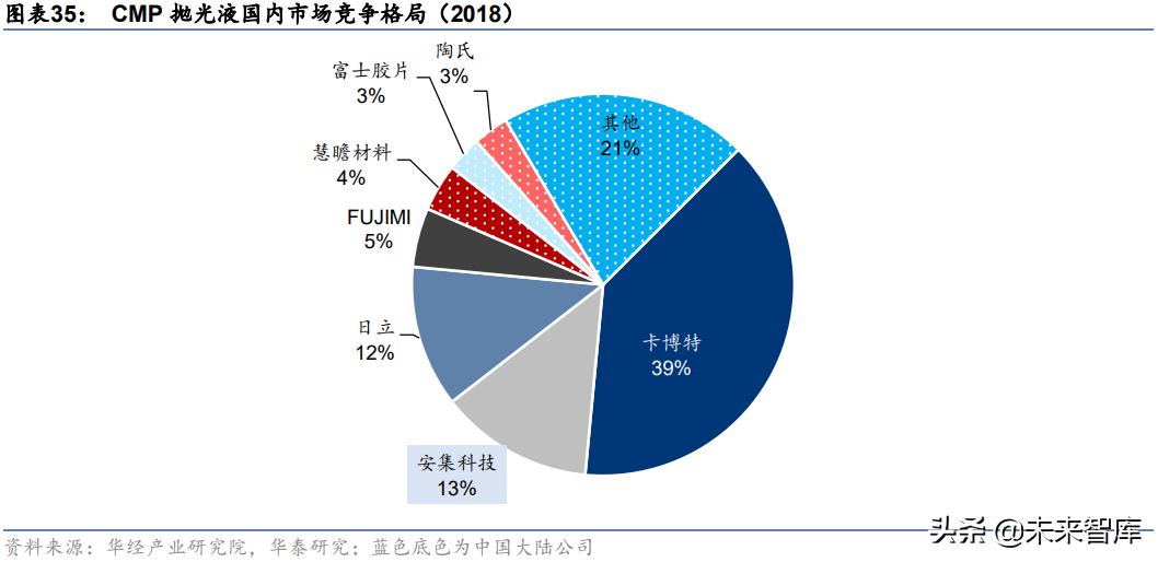 CMP 拋光液。CMP 拋光液為半導(dǎo)體制造材料中 CMP 拋光材料的重要組成,位于半導(dǎo)體產(chǎn) 業(yè)鏈的上游(支撐產(chǎn)業(yè))。2018 年中國主要 CMP 拋光液供應(yīng)商中,卡博特處于絕對領(lǐng)先地 位,市占率達(dá) 39%,中資企業(yè)僅安集科技一家進(jìn)入主要供應(yīng)商,市占率為 13%。遠(yuǎn)期空間: 若國產(chǎn)化率從 13%提升至 18%(+5pct),中資 CMP 拋光液企業(yè) 5 年(2021-2025E)年化 營收增速有望達(dá)到 27%;中期空間:根據(jù) Wind 一致預(yù)期,中資 CMP 拋光液龍頭三年 (2021-2023E)年化營收增速有望達(dá) 36%。
