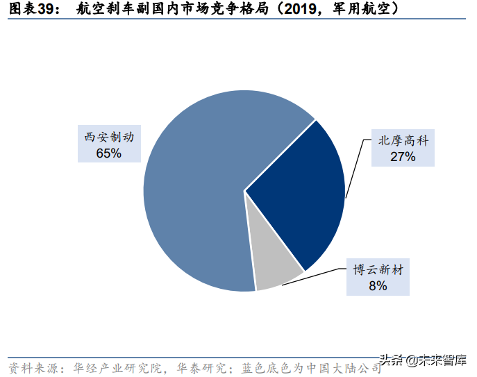 航空剎車副。剎車副是用于飛機(jī)起落滑行剎車制動的裝置,是飛機(jī)安全運行的重要保證, 與發(fā)動機(jī)并列為飛機(jī) A 類關(guān)鍵性部件,位于航空裝備產(chǎn)業(yè)鏈中游。國內(nèi)軍機(jī)的主要航空剎車副供應(yīng)商包括西安制動(市占率 65%)、北摩高科(27%)、博云新材(8%),但在民用 航空領(lǐng)域,中資企業(yè)尚未切入主要供應(yīng)鏈,市場主導(dǎo)者為美國 Honeywell、B.F.Goodrich、 ABS(Aircraft Braking System),法國 Messier-Bugatti、英國 Dunlop 五家企業(yè)。根據(jù) Wind 一致預(yù)期,中資航空剎車副龍頭三年(2021-2023E)年化營收增速有望達(dá) 42%。