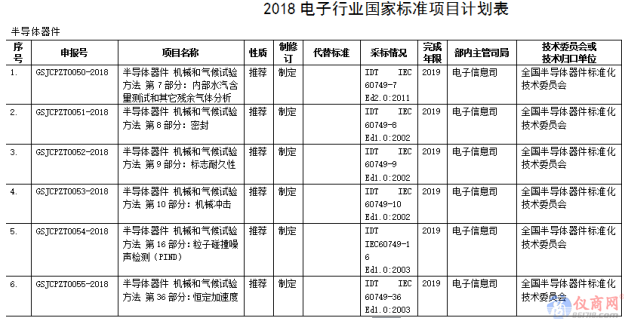 與此同時(shí),2018年第二季度推薦性國(guó)家標(biāo)準(zhǔn)制修訂計(jì)劃接踵而至。包括電子行業(yè)標(biāo)準(zhǔn)項(xiàng)目計(jì)劃和通信行業(yè)標(biāo)準(zhǔn)項(xiàng)目計(jì)劃,涉及半導(dǎo)體器件、電子設(shè)備用機(jī)電元件、光纖光纜等。