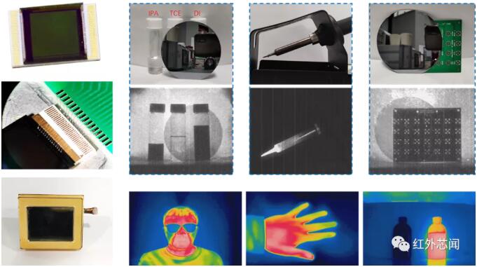 中芯熱成首輪融資用于在北京設(shè)立企業(yè)研發(fā)中心,具備激光直寫光刻、蒸發(fā)鍍膜、線綁定及激光鍵合等完整封裝工藝能力。目前,中芯熱成與北京理工大學(xué)光電學(xué)院紅外量子點(diǎn)團(tuán)隊(duì)合作,成功封裝、測(cè)試國(guó)內(nèi)首個(gè)膠體量子點(diǎn)短波焦平面及中波紅外焦平面器件。實(shí)現(xiàn)了2.5微米及5微米截止波段的量子點(diǎn)成像測(cè)試組件(圖二),并可提供1.5微米~6.0微米波段范圍內(nèi)任意截止波長(zhǎng)的多面陣規(guī)格紅外芯片,為工業(yè)檢測(cè)、氣體探測(cè)、汽車自動(dòng)駕駛等多種應(yīng)用領(lǐng)域提供強(qiáng)勁技術(shù)支撐。