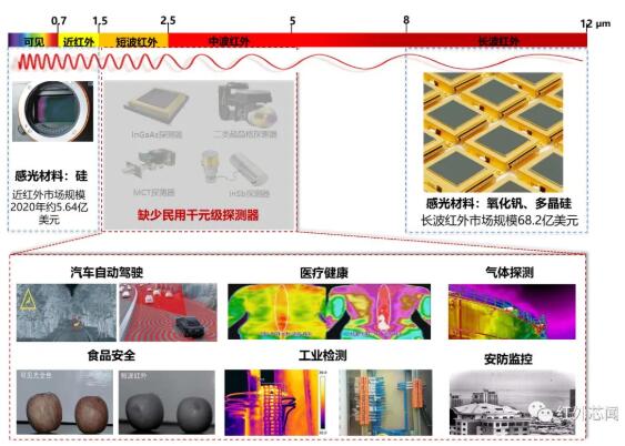 短波紅外相機(jī)可用于多種應(yīng)用,包括芯片無(wú)損探傷、太陽(yáng)能電池檢查、化學(xué)品識(shí)別和分類及防偽識(shí)別等。中波探測(cè)器在大氣光學(xué)檢測(cè)、環(huán)境監(jiān)測(cè)、自由空間光通訊、煤礦安全、分子光譜測(cè)量等領(lǐng)域表現(xiàn)出應(yīng)用潛力。短波及中波紅外相機(jī)由于技術(shù)難度大,行業(yè)壁壘高,價(jià)格高昂,難以滲透民用市場(chǎng)。