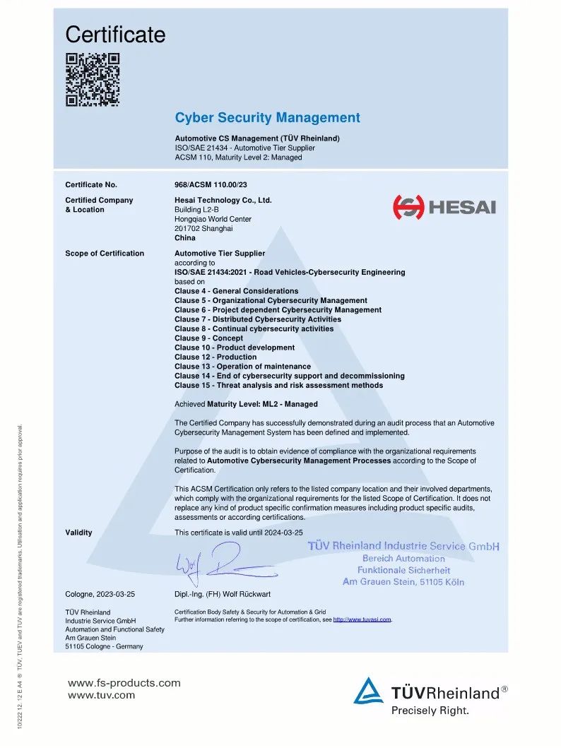 近日,禾賽科技宣布獲得由國際權(quán)威第三方檢測和認證機構(gòu)德國萊茵 TüV 頒發(fā)的 ISO/SAE 21434 汽車網(wǎng)絡(luò)安全管理體系認證證書,成為激光雷達(LiDAR)領(lǐng)域中第一個獲得該認證的公司。這是禾賽科技在網(wǎng)絡(luò)安全領(lǐng)域中的又一重大成果,展現(xiàn)了其在體系建設(shè)、車規(guī)級安全保障方面的卓越能力。