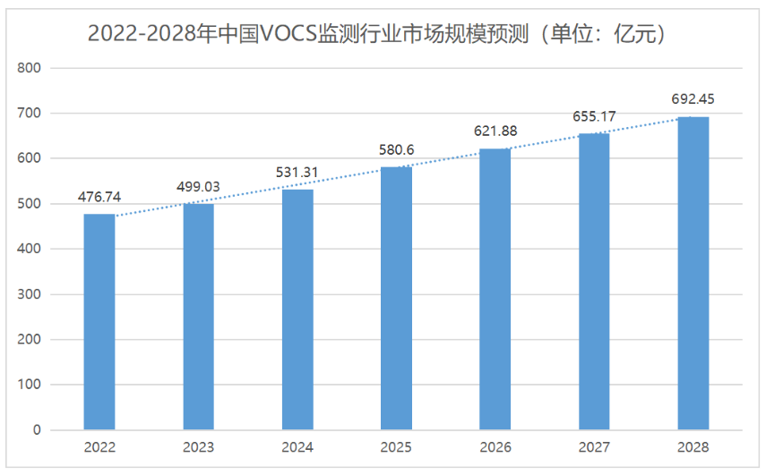 據(jù)南方+記者了解到,VOCs,即揮發(fā)性有機(jī)物,是形成PM2.5和臭氧的重要前體,對(duì)人體健康產(chǎn)生直接和間接影響。國(guó)家“十四五”規(guī)劃明確提出,到2035年,VOCs排放總量要減少10%以上,這體現(xiàn)了國(guó)家治理VOCs的決心。工業(yè)是人為VOCs排放的主要來源之一,占比近半。實(shí)現(xiàn)VOCs治理的前提是VOCs檢測(cè)。有研究顯示,受中國(guó)VOCS監(jiān)測(cè)行業(yè)需求的增長(zhǎng),2022-2028年中國(guó)VOCS監(jiān)測(cè)行業(yè)市場(chǎng)規(guī)模平穩(wěn)上升,2024年中國(guó)VOCS監(jiān)測(cè)行業(yè)市場(chǎng)規(guī)模預(yù)計(jì)達(dá)到531.31億元,2028年將達(dá)692.45億元。