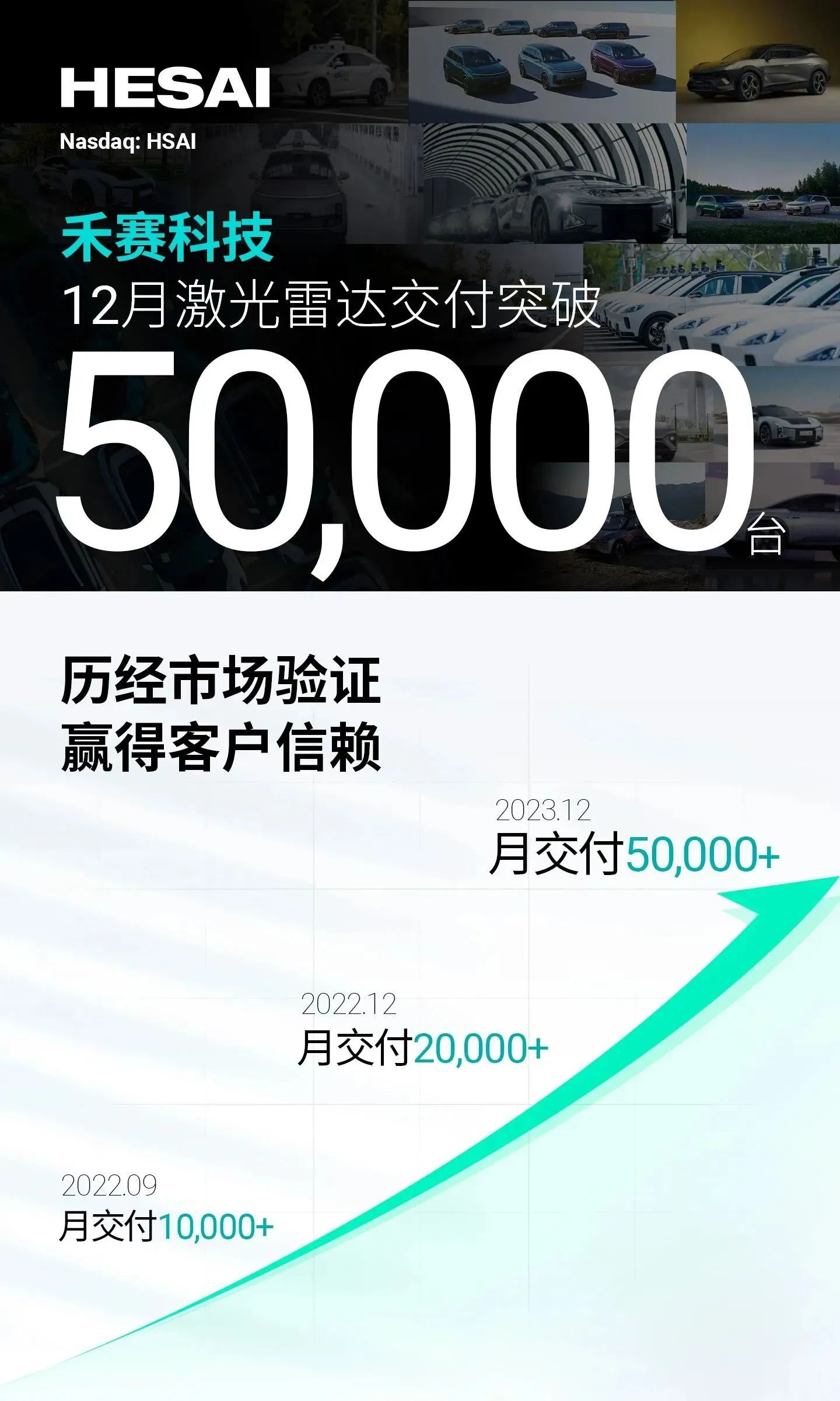 今日,全球激光雷達(dá)領(lǐng)導(dǎo)者禾賽科技宣布 2023 年 12 月的交付數(shù)據(jù)成功突破 5 萬(wàn)大關(guān),成為車(chē)載激光雷達(dá)行業(yè)首個(gè)單月交付量突破 5 萬(wàn)臺(tái)的公司。這不僅是禾賽發(fā)展的重要里程碑,更是全球激光雷達(dá)產(chǎn)業(yè)的高光時(shí)刻。
