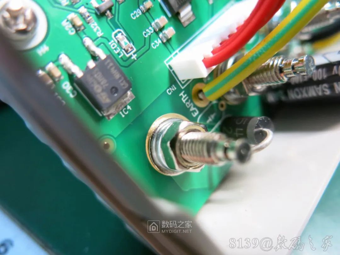 電源的輸出母座是用螺絲+防松墊擰在板子上的,非常緊,旁邊還有一堆線和電容、二極管,非常牢固,小心翼翼的弄了半天才拆下來。