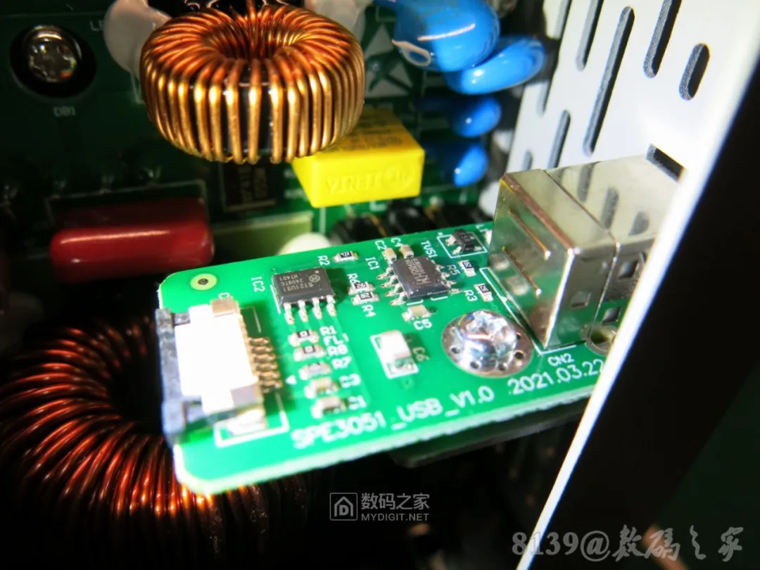 電源后面是連接上位機的USB接口小板,一顆CH340負責把USB轉(zhuǎn)成RS232,然后還有一顆Π121U31的雙通道數(shù)字隔離配合工作。
