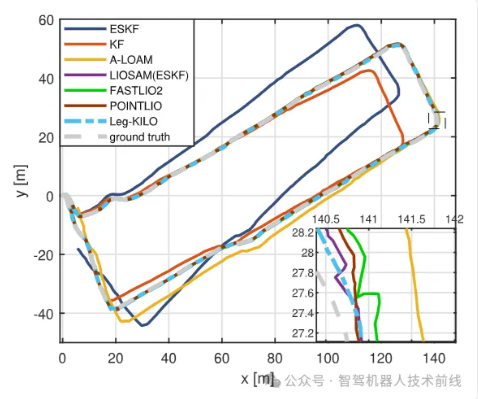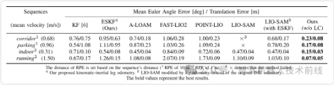 全面的實(shí)驗(yàn)驗(yàn)證與數(shù)據(jù)共享:在室內(nèi)外高動(dòng)態(tài)環(huán)境下驗(yàn)證了方法的魯棒性和精確性,結(jié)果優(yōu)于其他LiDAR慣性里程計(jì)方法,同時(shí)公開了包含腿部運(yùn)動(dòng)學(xué)數(shù)據(jù)的LiDAR慣性數(shù)據(jù)集和代碼,促進(jìn)了社區(qū)研究。