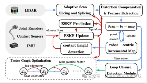通過因子圖緊密耦合腿部里程計(jì)、LiDAR里程計(jì)和回環(huán)檢測(cè):