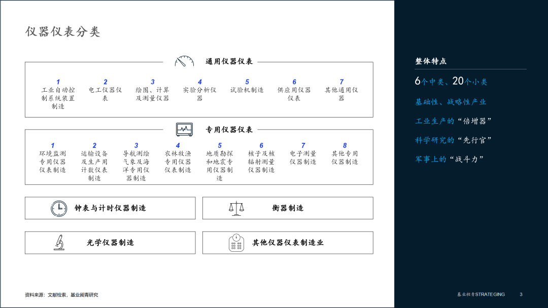 儀器儀表是指專門從事研究、設(shè)計、制造、銷售和服務(wù)于科學(xué)研究、生產(chǎn)和生活中所需的各種儀器、儀表和自動化設(shè)備。按照新修訂的《國民經(jīng)濟(jì)行業(yè)分類》國家標(biāo)準(zhǔn)(GB/T4754-2017),儀器儀表主要包括6個中類、20個小類。儀器儀表行業(yè)作為國民經(jīng)濟(jì)的基礎(chǔ)性、戰(zhàn)略性產(chǎn)業(yè),是工業(yè)生產(chǎn)的“倍增器” 、科學(xué)研究的“先行官”、軍事上的“戰(zhàn)斗力” ,下游領(lǐng)域覆蓋石油、化工、火電、核電、冶金、城市軌道交通、節(jié)能環(huán)保等多個領(lǐng)域,是國家經(jīng)濟(jì)發(fā)展和技術(shù)進(jìn)步的重要組成部分。