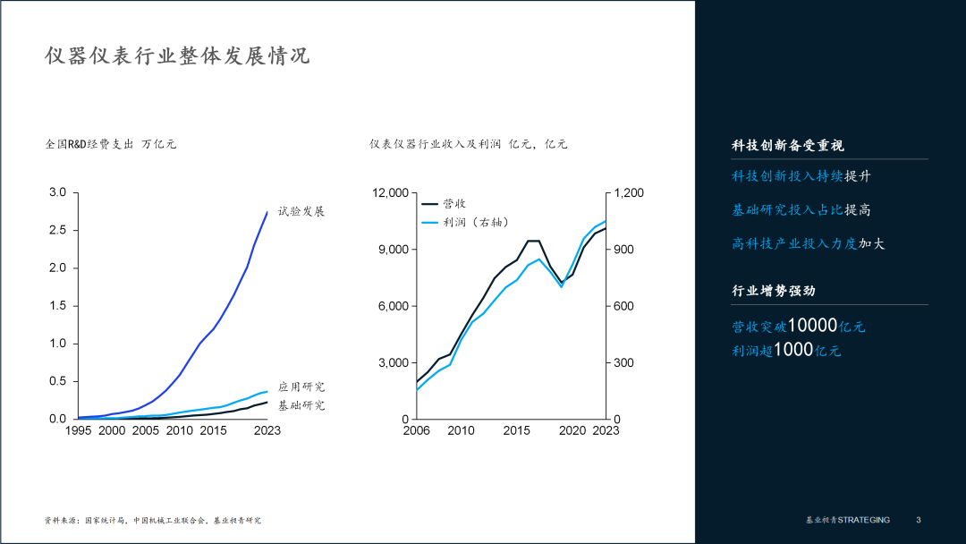 工業(yè)體系和科技的發(fā)展是儀器儀表行業(yè)穩(wěn)健增長的基石。2023年我國R&D經(jīng)費(fèi)支出達(dá)3.33萬億元,強(qiáng)度達(dá)2.64%,較2020年投入增加了近9000億元,強(qiáng)度提升0.24個百分點(diǎn)。隨著我國前沿性科學(xué)研究和高科技產(chǎn)業(yè)發(fā)展,儀器儀表行業(yè)具備長期成長性。2017年以前儀器儀表行業(yè)市場規(guī)?;颈3种鹉旮咚僭鲩L趨勢,市場韌性較強(qiáng),盡管2018-2019年收入有所回落,但隨后又重回增長通道。2023年,行業(yè)規(guī)模已突破萬億大關(guān),達(dá)10112億元,利潤總額1050萬元。